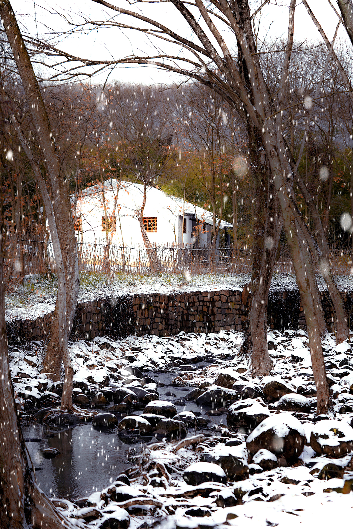 在都梁阁的飞檐,铁山寺的门帘,第一山的树间。溪水边,松针尖,森林小屋忽现。一场雪后,冬日的都梁变成银装素裹的世界。一片白雪皑皑,寒雾笼纱,身在其中,凝神静品,远处隐约空蒙,近处清明沉静。